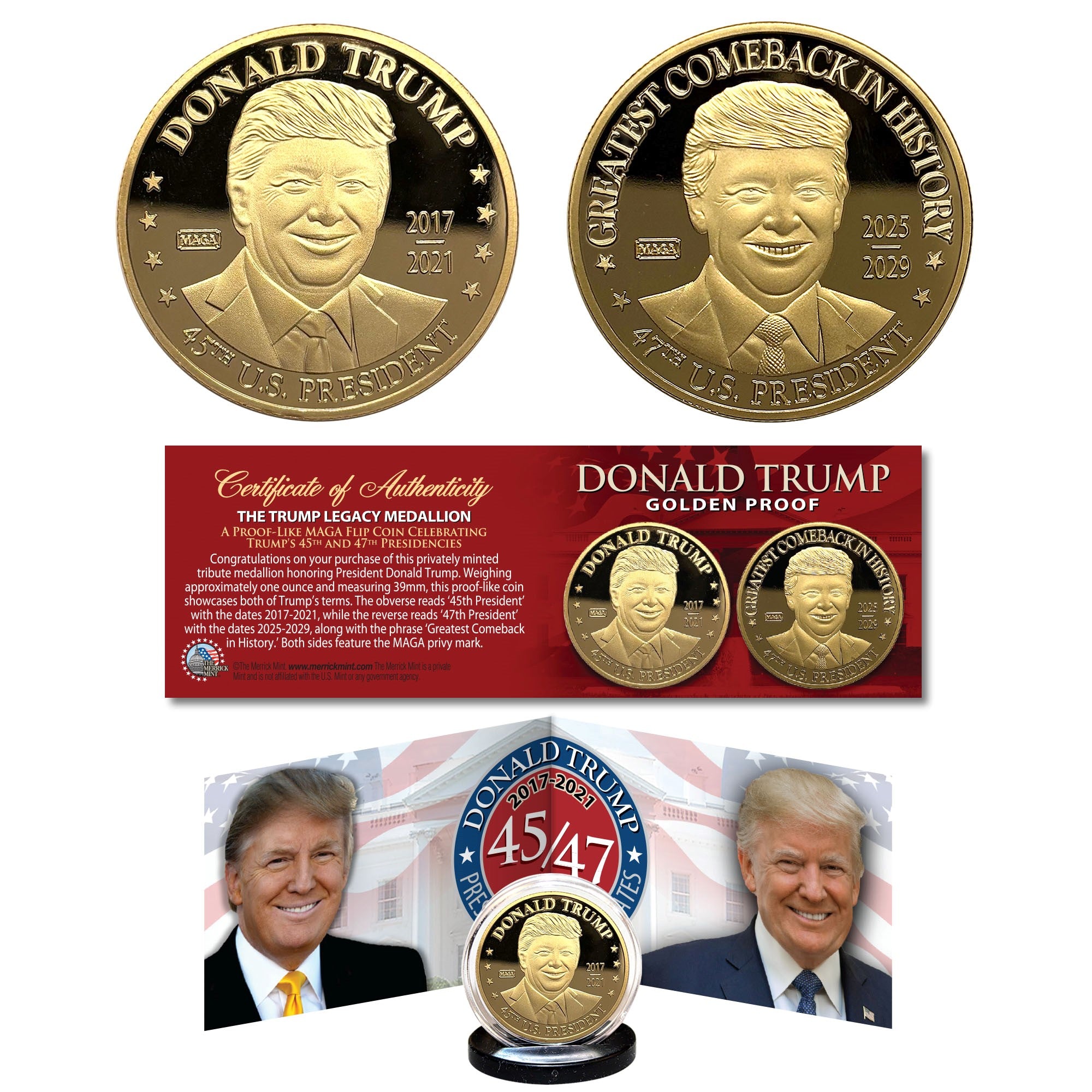 This meticulously crafted coin honors a remarkable achievement, becoming the second U.S. president to win two non-consecutive terms as the 45th President and now 47th President of the United States of America.