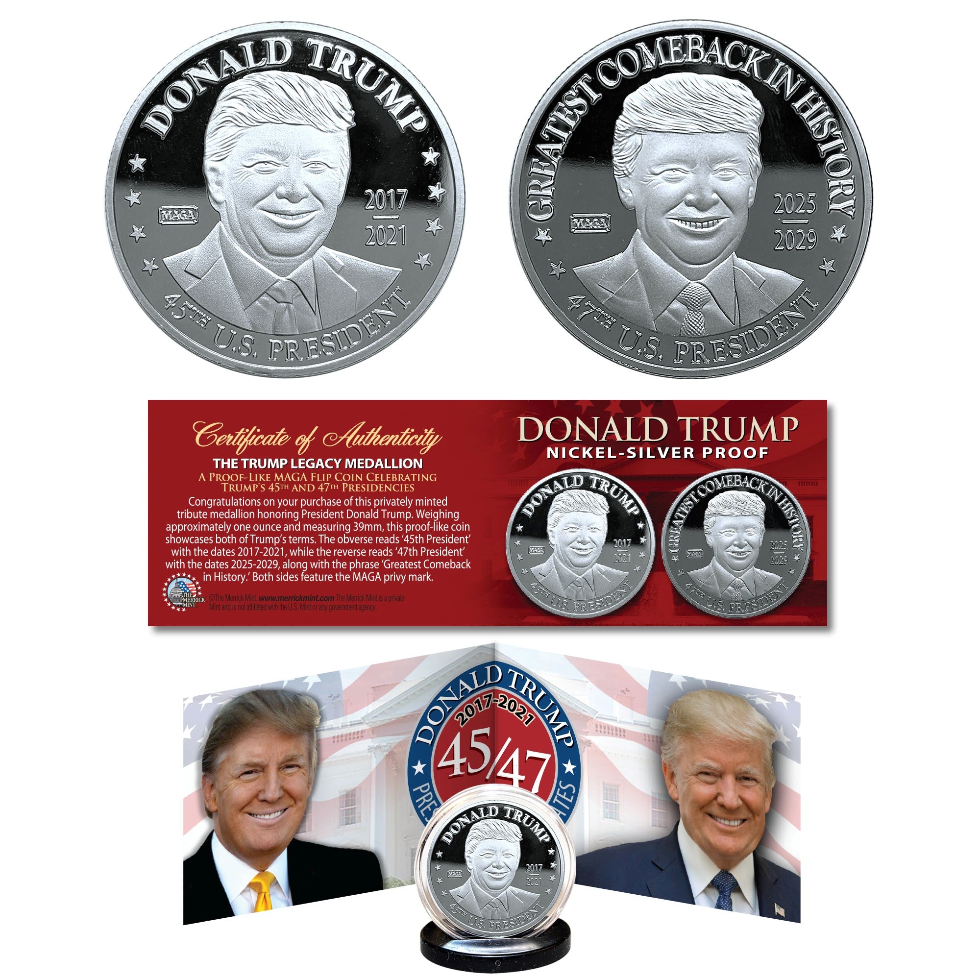 This meticulously crafted coin honors a remarkable achievement, becoming the second U.S. president to win two non-consecutive terms as the 45th President and now 47th President of the United States of America.